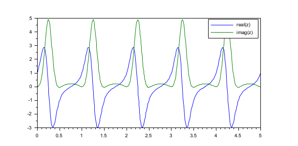 Unlike the native implementation, the SUNDIALS solvers Scilab interface allows to solve a system of equations, ODEs or DAEs if the solution is complex, when the user functions (right hand side or residual, Jacobian) are given by Scilab functions. For example, for an ODE, the solution is complex when the right hand side always yields complex values or when the initial condition is complex, even if the right hand side is a real function. Here is a basic example: