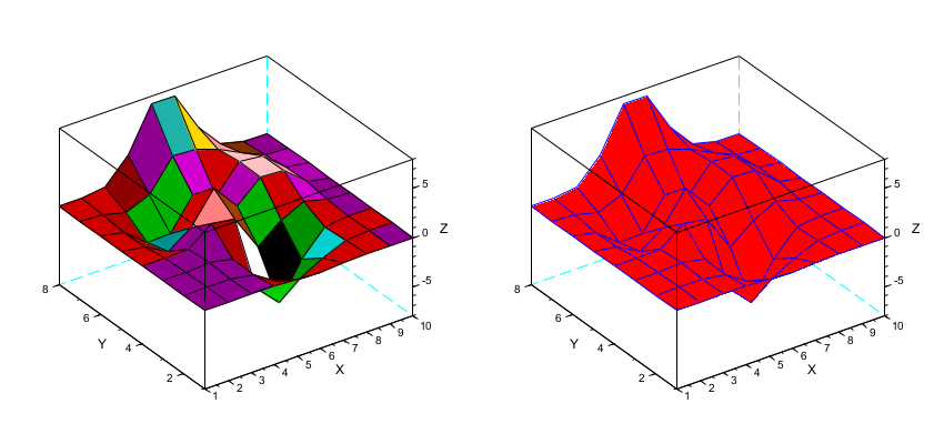 // Z initialisation Z= [0.0001 0.0013 0.0053 -0.0299 -0.1809 -0.2465 -0.1100 -0.0168 -0.0008 -0.0000 0.0005 0.0089 0.0259 -0.3673 -1.8670 -2.4736 -1.0866 -0.1602 -0.0067 0.0000 0.0004 0.0214 0.1739 -0.3147 -4.0919 -6.4101 -2.7589 -0.2779 0.0131 0.0020 -0.0088 -0.0871 0.0364 1.8559 1.4995 -2.2171 -0.2729 0.8368 0.2016 0.0130 -0.0308 -0.4313 -1.7334 -0.1148 3.0731 0.4444 2.6145 2.4410 0.4877 0.0301 -0.0336 -0.4990 -2.3552 -2.1722 0.8856 -0.0531 2.6416 2.4064 0.4771 0.0294 -0.0137 -0.1967 -0.8083 0.2289 3.3983 3.1955 2.4338 1.2129 0.2108 0.0125 -0.0014 -0.0017 0.3189 2.7414 7.1622 7.1361 3.1242 0.6633 0.0674 0.0030]; clf // simple surface subplot(121) surf(Z); // Note that X and Y are determined by Z dimensions // same surface with red face color and blue edges subplot(122) surf(Z,'facecol','red','edgecol','blu'); gcf().axes_size = [850 400];