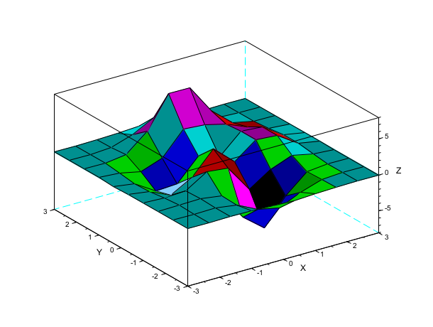 // X and Y initialisation // NB: here, X has the same lines and Y the same columns X=[-3.0000 -2.3333 -1.6667 -1.0000 -0.3333 0.3333 1.0000 1.6667 2.3333 3.0000 -3.0000 -2.3333 -1.6667 -1.0000 -0.3333 0.3333 1.0000 1.6667 2.3333 3.0000 -3.0000 -2.3333 -1.6667 -1.0000 -0.3333 0.3333 1.0000 1.6667 2.3333 3.0000 -3.0000 -2.3333 -1.6667 -1.0000 -0.3333 0.3333 1.0000 1.6667 2.3333 3.0000 -3.0000 -2.3333 -1.6667 -1.0000 -0.3333 0.3333 1.0000 1.6667 2.3333 3.0000 -3.0000 -2.3333 -1.6667 -1.0000 -0.3333 0.3333 1.0000 1.6667 2.3333 3.0000 -3.0000 -2.3333 -1.6667 -1.0000 -0.3333 0.3333 1.0000 1.6667 2.3333 3.0000 -3.0000 -2.3333 -1.6667 -1.0000 -0.3333 0.3333 1.0000 1.6667 2.3333 3.0000 -3.0000 -2.3333 -1.6667 -1.0000 -0.3333 0.3333 1.0000 1.6667 2.3333 3.0000 -3.0000 -2.3333 -1.6667 -1.0000 -0.3333 0.3333 1.0000 1.6667 2.3333 3.0000]; Y=[-3.0000 -3.0000 -3.0000 -3.0000 -3.0000 -3.0000 -3.0000 -3.0000 -3.0000 -3.0000 -2.3333 -2.3333 -2.3333 -2.3333 -2.3333 -2.3333 -2.3333 -2.3333 -2.3333 -2.3333 -1.6667 -1.6667 -1.6667 -1.6667 -1.6667 -1.6667 -1.6667 -1.6667 -1.6667 -1.6667 -1.0000 -1.0000 -1.0000 -1.0000 -1.0000 -1.0000 -1.0000 -1.0000 -1.0000 -1.0000 -0.3333 -0.3333 -0.3333 -0.3333 -0.3333 -0.3333 -0.3333 -0.3333 -0.3333 -0.3333 0.3333 0.3333 0.3333 0.3333 0.3333 0.3333 0.3333 0.3333 0.3333 0.3333 1.0000 1.0000 1.0000 1.0000 1.0000 1.0000 1.0000 1.0000 1.0000 1.0000 1.6667 1.6667 1.6667 1.6667 1.6667 1.6667 1.6667 1.6667 1.6667 1.6667 2.3333 2.3333 2.3333 2.3333 2.3333 2.3333 2.3333 2.3333 2.3333 2.3333 3.0000 3.0000 3.0000 3.0000 3.0000 3.0000 3.0000 3.0000 3.0000 3.0000]; Z= [0.0001 0.0013 0.0053 -0.0299 -0.1809 -0.2465 -0.1100 -0.0168 -0.0008 -0.0000 0.0005 0.0089 0.0259 -0.3673 -1.8670 -2.4736 -1.0866 -0.1602 -0.0067 0.0000 0.0004 0.0214 0.1739 -0.3147 -4.0919 -6.4101 -2.7589 -0.2779 0.0131 0.0020 -0.0088 -0.0871 0.0364 1.8559 1.4995 -2.2171 -0.2729 0.8368 0.2016 0.0130 -0.0308 -0.4313 -1.7334 -0.1148 3.0731 0.4444 2.6145 2.4410 0.4877 0.0301 -0.0336 -0.4990 -2.3552 -2.1722 0.8856 -0.0531 2.6416 2.4064 0.4771 0.0294 -0.0137 -0.1967 -0.8083 0.2289 3.3983 3.1955 2.4338 1.2129 0.2108 0.0125 -0.0014 -0.0017 0.3189 2.7414 7.1622 7.1361 3.1242 0.6633 0.0674 0.0030 0.0002 0.0104 0.1733 1.0852 2.6741 2.6725 1.1119 0.1973 0.0152 0.0005 0.0000 0.0012 0.0183 0.1099 0.2684 0.2683 0.1107 0.0190 0.0014 0.0000]; scf(3) surf(X,Y,Z)
