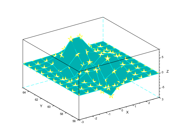 X = [ -3.0000 -2.3333 -1.6667 -1.0000 -0.3333 0.3333 1.0000 1.6667 2.3333 3.0000 -3.0000 -2.3333 -1.6667 -1.0000 -0.3333 0.3333 1.0000 1.6667 2.3333 3.0000 -3.0000 -2.3333 -1.6667 -1.0000 -0.3333 0.3333 1.0000 1.6667 2.3333 3.0000 -3.0000 -2.3333 -1.6667 -1.0000 -0.3333 0.3333 1.0000 1.6667 2.3333 3.0000 -3.0000 -2.3333 -1.6667 -1.0000 -0.3333 0.3333 1.0000 1.6667 2.3333 3.0000 -3.0000 -2.3333 -1.6667 -1.0000 -0.3333 0.3333 1.0000 1.6667 2.3333 3.0000 -3.0000 -2.3333 -1.6667 -1.0000 -0.3333 0.3333 1.0000 1.6667 2.3333 3.0000 -3.0000 -2.3333 -1.6667 -1.0000 -0.3333 0.3333 1.0000 1.6667 2.3333 3.0000 -3.0000 -2.3333 -1.6667 -1.0000 -0.3333 0.3333 1.0000 1.6667 2.3333 3.0000 -3.0000 -2.3333 -1.6667 -1.0000 -0.3333 0.3333 1.0000 1.6667 2.3333 3.0000]; Y= [ -3.0000 -3.0000 -3.0000 -3.0000 -3.0000 -3.0000 -3.0000 -3.0000 -3.0000 -3.0000 -2.3333 -2.3333 -2.3333 -2.3333 -2.3333 -2.3333 -2.3333 -2.3333 -2.3333 -2.3333 -1.6667 -1.6667 -1.6667 -1.6667 -1.6667 -1.6667 -1.6667 -1.6667 -1.6667 -1.6667 -1.0000 -1.0000 -1.0000 -1.0000 -1.0000 -1.0000 -1.0000 -1.0000 -1.0000 -1.0000 -0.3333 -0.3333 -0.3333 -0.3333 -0.3333 -0.3333 -0.3333 -0.3333 -0.3333 -0.3333 0.3333 0.3333 0.3333 0.3333 0.3333 0.3333 0.3333 0.3333 0.3333 0.3333 1.0000 1.0000 1.0000 1.0000 1.0000 1.0000 1.0000 1.0000 1.0000 1.0000 1.6667 1.6667 1.6667 1.6667 1.6667 1.6667 1.6667 1.6667 1.6667 1.6667 2.3333 2.3333 2.3333 2.3333 2.3333 2.3333 2.3333 2.3333 2.3333 2.3333 3.0000 3.0000 3.0000 3.0000 3.0000 3.0000 3.0000 3.0000 3.0000 3.0000]; Z= [ 0.0001 0.0013 0.0053 -0.0299 -0.1809 -0.2465 -0.1100 -0.0168 -0.0008 -0.0000 0.0005 0.0089 0.0259 -0.3673 -1.8670 -2.4736 -1.0866 -0.1602 -0.0067 0.0000 0.0004 0.0214 0.1739 -0.3147 -4.0919 -6.4101 -2.7589 -0.2779 0.0131 0.0020 -0.0088 -0.0871 0.0364 1.8559 1.4995 -2.2171 -0.2729 0.8368 0.2016 0.0130 -0.0308 -0.4313 -1.7334 -0.1148 3.0731 0.4444 2.6145 2.4410 0.4877 0.0301 -0.0336 -0.4990 -2.3552 -2.1722 0.8856 -0.0531 2.6416 2.4064 0.4771 0.0294 -0.0137 -0.1967 -0.8083 0.2289 3.3983 3.1955 2.4338 1.2129 0.2108 0.0125 -0.0014 -0.0017 0.3189 2.7414 7.1622 7.1361 3.1242 0.6633 0.0674 0.0030 0.0002 0.0104 0.1733 1.0852 2.6741 2.6725 1.1119 0.1973 0.0152 0.0005 0.0000 0.0012 0.0183 0.1099 0.2684 0.2683 0.1107 0.0190 0.0014 0.0000]; scf(2) surf(X,Y,Z,'colorda',ones(10,10),'edgeco','cya','marker','penta','markersiz',20,'markeredg','yel','ydata',56:65)