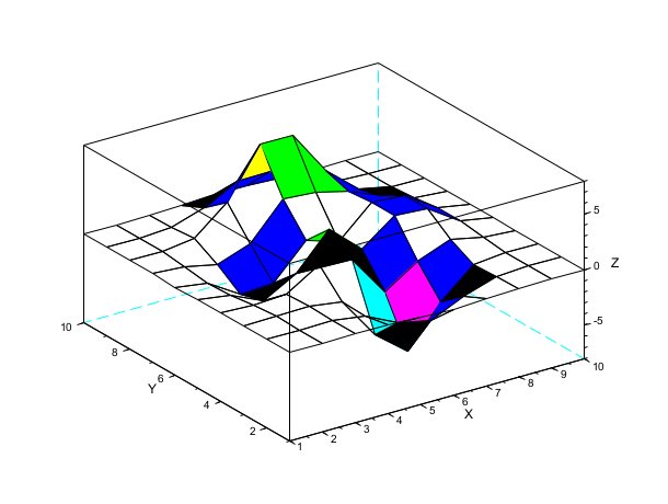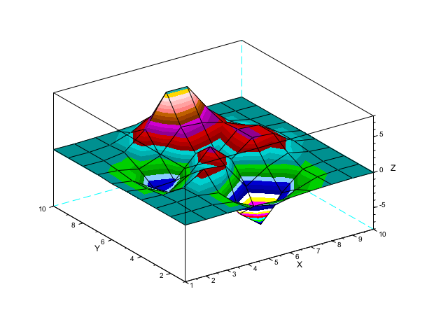 Z= [ 0.0001 0.0013 0.0053 -0.0299 -0.1809 -0.2465 -0.1100 -0.0168 -0.0008 -0.0000 0.0005 0.0089 0.0259 -0.3673 -1.8670 -2.4736 -1.0866 -0.1602 -0.0067 0.0000 0.0004 0.0214 0.1739 -0.3147 -4.0919 -6.4101 -2.7589 -0.2779 0.0131 0.0020 -0.0088 -0.0871 0.0364 1.8559 1.4995 -2.2171 -0.2729 0.8368 0.2016 0.0130 -0.0308 -0.4313 -1.7334 -0.1148 3.0731 0.4444 2.6145 2.4410 0.4877 0.0301 -0.0336 -0.4990 -2.3552 -2.1722 0.8856 -0.0531 2.6416 2.4064 0.4771 0.0294 -0.0137 -0.1967 -0.8083 0.2289 3.3983 3.1955 2.4338 1.2129 0.2108 0.0125 -0.0014 -0.0017 0.3189 2.7414 7.1622 7.1361 3.1242 0.6633 0.0674 0.0030 0.0002 0.0104 0.1733 1.0852 2.6741 2.6725 1.1119 0.1973 0.0152 0.0005 0.0000 0.0012 0.0183 0.1099 0.2684 0.2683 0.1107 0.0190 0.0014 0.0000]; surf(Z,'facecol','interp') // interpolated shading mode (color_flag == 3)