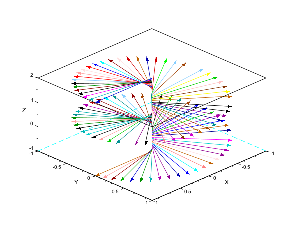 N = 100; zi = linspace(-1,2,N); zf = zi; theta = (zi - min(zi))/(max(zi)-min(zi))*720; xi = zeros(1,N); xf = cosd(theta); yi = zeros(1,N); yf = sind(theta); clf, plot3d([-1 1 1 1],[-1 -1 -1 1],[-1 -1 2 2]) xarrows([xi;xf],[yi;yf],[zi;zf],0.7, 32*rand(1,N))