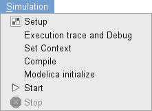 This menu item opens a specific dialog to the Modelica compiler where you can see the components of your model and also select the solver between the Kinsol, Ida, Fsolve, Optim, Nelder Mead and Hompack solvers.