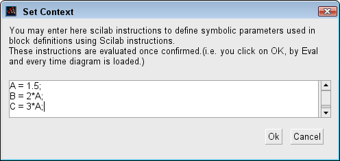 These instructions will be evaluated each time the diagram is loaded. If you change the value of a symbolic Xcos parameters in the context, all the blocks that contains this symbolic parameter are updated when you click on OK. By example if you want to set the value of gain of several blocks to a value which depends on a single value, you can proceed like this :