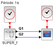 Dans cet exemple nous créons un genérateur d'onde carrée avec deux sorties inverses l'une de l'autre. en utilisant un bloc SUPER_f avec le contenu décrit par la figure suivante, dans laquelle vous pouvez voir l'utilisation du bloc CLKINV_f comme entrée d'événement du générateur d'onde carrée.