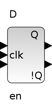Ce bloc sort son état d'entrée (D) quand l'entrée de validation (en) est à 1 sur le front montant de l'horloge clk. La sortie !Q est la négation logique de Q. Cette bascule est aussi connue comme une bascule de retard puisque l'état de l'entrée n'est modifié qu'au front montant suivant de l'horloge.