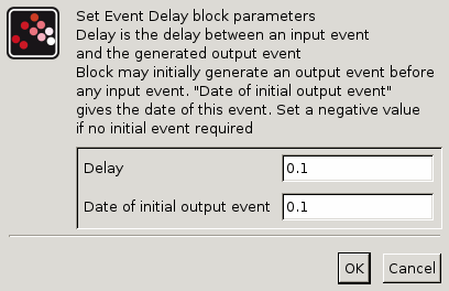One event is generated Delay after an event enters the unique input event port. The initial output event is also defined through parameters. The event date of that block is computed by the formula :