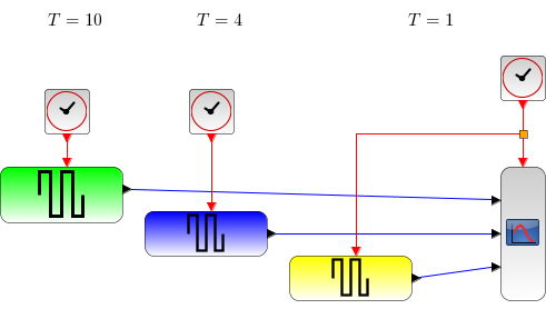 The first source block (green) illustrate the typical use of this block. The period of each output level is set with a clock. The signal edge is fast and should be accurate for most of the application with a edge speed ratio of 1/10.