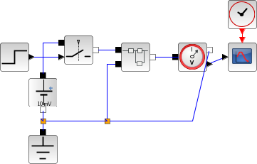 L'exemple suivant montre l'utilisation du bloc INIMPL_f. Le Super-bloc contient un circuit électrique simple avec deux entrées, une sur la résistance, l'autre pour la masse. Ces entrées sont connectées à l'environnement extérieur du bloc à travers deux blocs INIMPL_f numérotés 1 et 2. La sortie du Super-bloc est connectée via le bloc OUTIMPL_f.