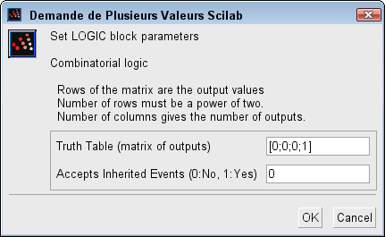 L'utilisateur doit spécifier une matrice qui définit toutes les sorties de bloc possibles dans le champ Truth Table. En conséquence, le nombre de lignes doit être une puissance de deux. Chaque ligne de la matrice contient une combinaison logique des éléments d'entrée
