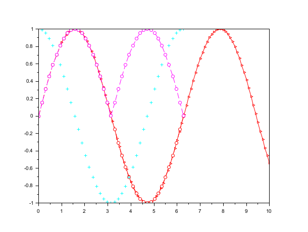 //multiple plots with different LineSpecs clf(); t=0:%pi/20:2*%pi; plot(t,sin(t),'ro-.',t,cos(t),'cya+',t,abs(sin(t)),'--mo')