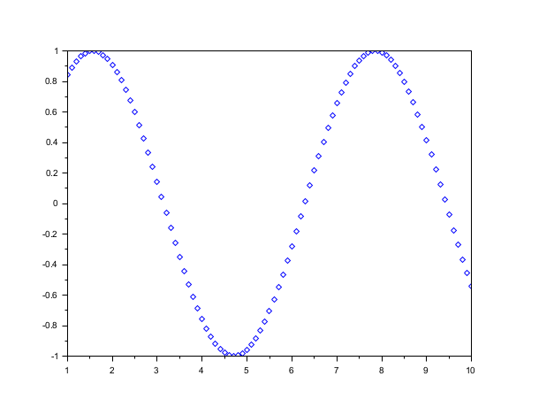 clf(); x=1:0.1:10; // If you specify a marker without a line style, only the marker is drawn plot(x,sin(x),'d')