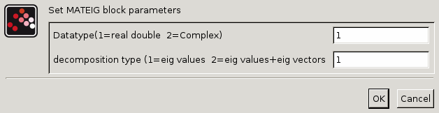 Le bloc MATEIG calcule les valeurs et les vecteurs propres d'une matrice carrée d'entrée U. Quand le paramètre decomposition type est initialisé à :