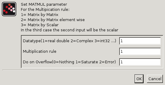 Quand ce paramètre est mis à zéro le résultat est similaire à la multiplication normale de deux matrices entières. Quand il est à 1, lors d'un dépassement de capacité le bloc sature le résultat. Quand il est à 2, lors d'un dépassement de capacité un dialogue de message d'erreur est affiché.