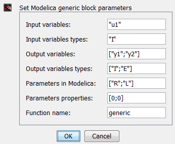 The Modelica class name is specified in this filed. If the Modelica class name is specified without any path or extension, an interactive window is opened and the user can write or edit the Modelica program. This window is opened each time the user clicks on the block. If the Modelica class name is specified with path and '.mo' extension, the compiler looks for the file and if it is found, the file will be compiled, otherwise a window is opened and the user can write the Modelica program. This Modelica file will be saved with the given filename in the specified path. The next time, only input/output characteristics of the block can be changed, and the Modelica file should be edited with another text editor.