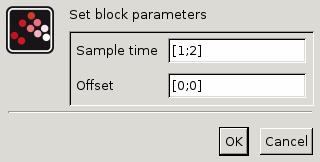 This blocks generates events at specific sample time of the simulation time. The sample time is given in the "Sample Time" field and the offset is given in the "Offset" field. This block has one event input, the number of event outputs depends on the number of different sample time. For example if the vector of sample time is [1 1 2] and the vector of offset is [0 .5 0] then the block has 7 outputs.