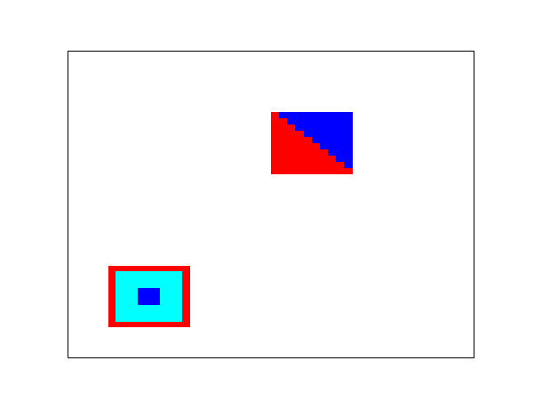 clf(); ax = gca();//get current axes handle ax.data_bounds = [0, 0; 10, 10]; //set the data_bounds ax.box = 'on'; //draw a box a = 5*ones(11,11); a(2:10, 2:10) = 4; a(5:7, 5:7) = 2; // first matrix in rectangle [1,1,3,3] Matplot1(a, [1,1,3,3]) a = ones(10,10); a = 3*tril(a)+ 2*a; // second matrix in rectangle [5,6,7,8] Matplot1(a,[5,6,7,8])