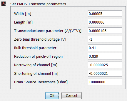 Le modèle PMOS est une modèle simple de semiconducteur FET métal-oxyde canal p. Il différe légérement du dispositif utilisé dans le simulateur SPICE. Pour plus de détails référez-vous à H. Spiro.