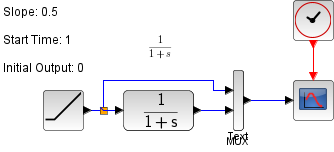 This diagram shows the use of RAMP block to obtain the response to a ramp signal of a first order's system defined by a transfer function.