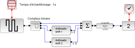 Dans cet exemple le Super bloc est un compteur binaire 3 bits. De façon à obtenir les données décimales correspondantes,