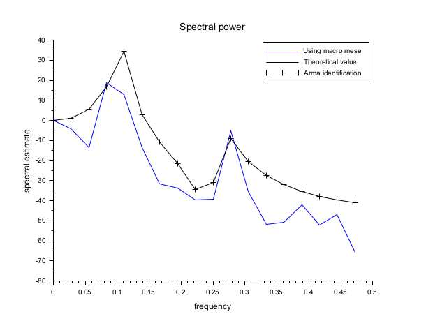 // Example extracted from the demo arma3.dem.sce in the cacsd module // Spectral power estimation // ( form Sawaragi et all) m = 18; a = [1,-1.3136,1.4401,-1.0919,+0.83527]; b = [0.0,0.13137,0.023543,0.10775,0.03516]; u = rand(1,1000,'n'); z = arsimul(a,b,[0],0,u); //----Using macro mese [sm,fr]=mese(z,m); //----The theoretical result function gx=gxx(z, a, b) w = exp(-%i*2*%pi*z*(0:4))' gx = abs(b*w)^2/(abs(a*w)^2); endfunction res=[]; for x=fr res=[ res, gxx(x,a,b)]; end //----using armax estimation of order (4,4) // it's a bit tricky because we are not supposed to know the order [arc,la,lb,sig,resid]=armax(4,4,z,u); res1=[]; for x=fr res1=[ res1, gxx(x,la(1),lb(1))]; end //-- visualization of the results plot2d([fr;fr;fr]',[20*log10(sm/sm(1));20*log10(res/res(1));20*log10(res1/res1(1))]',[2,1,-1]) legend(["Using macro mese";"Theoretical value";"Arma identification"]) xtitle("Spectral power","frequency","spectral estimate")