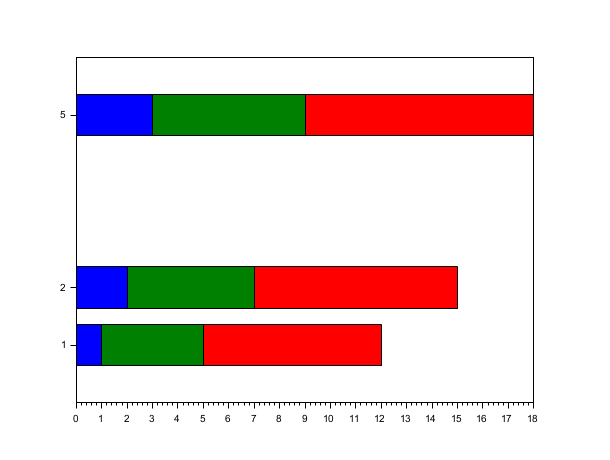 // Troisième exemple : dessine 3 barres (nombre de colonnes de y) style='stacked'. scf(2); x=[1 2 5]; y=[1 4 7;2 5 8;3 6 9]; barh(x,y,'stacked');