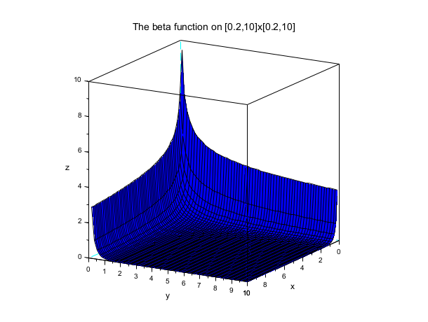 // example 3 : plotting the beta function t = linspace(0.2,10,60); X = t'*ones(t); Y = ones(t')*t; Z = beta(X,Y); clf() plot3d(t, t, Z, flag=[2 4 4], leg="x@y@z", alpha=75, theta=30) xtitle("The beta function on [0.2,10]x[0.2,10]") show_window()
