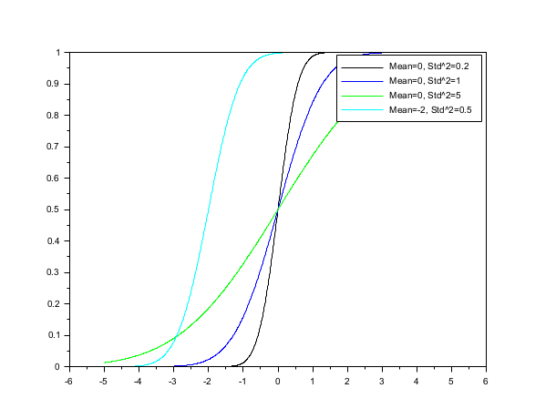 // Afficher la fonction h = scf(); Mean = [0 0 0 -2]; Std2 = [0.2 1.0 5.0 0.5]; cols = [1 2 3 4]; nf = size(cols,"*"); lgd = []; for k = 1 : nf x = linspace(-5,5,1000); P=cdfnor("PQ",x,Mean(k)*ones(x),sqrt(Std2(k))*ones(x)); plot(x,P) str = msprintf("Mean=%s, Std^2=%s",string(Mean(k)),string(Std2(k))); lgd($+1) = str; end for k = 1 : nf h.children.children.children(nf - k + 1).foreground = cols(k); end legend(lgd);