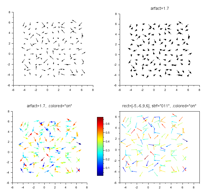 x = -4:6; X = ndgrid(x); [fx, fy] = (rand(X)-0.5, rand(X)-0.5); clf gcf().color_map = jet(50); // Field's intensity = arrows length subplot(2,2,1) champ(x, x, fx, fy) // With bigger arrow heads subplot(2,2,2) champ(x, x, fx, fy, arfact=1.7) title("arfact=1.7", "fontsize",3) // Field's intensity = arrows color xsetech([0 0.5 0.55 0.5]) h = champ(x, x, fx, fy, arfact=1.7) h.colored = "on"; title("arfact=1.7, .colored=""on""", "fontsize",3) colorbar // Field's intensity = color, + imposed boundaries subplot(2,2,4) h = champ(x, x, fx, fy, rect=[-5,-6,9,7],strf="011") h.colored = "on"; title("rect=[-5,-6,9,6], strf=""011"", .colored=""on""", "fontsize",3) gcf().axes_size = [740 680];