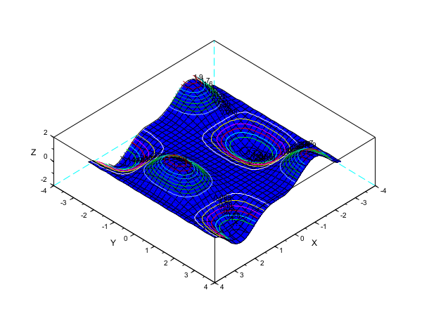 contour draws level curves of a surface z=f(x,y). The level curves are drawn on a 3D surface. The optional arguments are the same as for the function plot3d (except zlev) and their meanings are the same. They control the drawing of level curves on a 3D plot. Only flag(1)=mode has a special meaning.