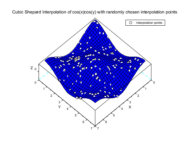 // interpolation of cos(x)cos(y) with randomly chosen interpolation points n = 150; // nb of interpolation points xy = grand(n,2,"unf",0,2*%pi); z = cos(xy(:,1)).*cos(xy(:,2)); xyz = [xy z]; tl_coef = cshep2d(xyz); // evaluation on a grid m = 30; xx = linspace(0,2*%pi,m); [X,Y] = ndgrid(xx,xx); Z = eval_cshep2d(X,Y, tl_coef); clf() plot3d(xx,xx,Z,flag=[2 6 4]) param3d1(xy(:,1),xy(:,2),list(z,-9), flag=[0 0]) xtitle("Cubic Shepard Interpolation of cos(x)cos(y) with randomly chosen interpolation points") legends("interpolation points",-9,1) show_window()