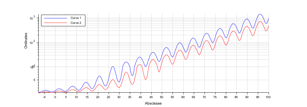 x = [-8:0.2:100]'; y = exp(x/14).*(1+0.5*sin(x)); intervals = [0.01 10 ; 10 max(y)]; clf gcf().axes_size = [1000 400]; [a, c] = cutaxes(x, [y y/2], "y", intervals, "widths", -[1 2]); c(2).foreground = color("red"); a(2).log_flags = "nln"; a(2).sub_ticks(2) = 8; xlabel Abscisses ylabel(a(2), "Ordonnées") // a(2) est maintenant le repère graphique actif legend(["Courbe 1" "Courbe 2"], "in_upper_left"); // Grille // a($).grid(1) = -1; // supprime la grille verticale commune // a(1:$-1).grid(:,2) = -1; // supprime les grilles horizontales