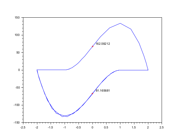 // Exemple avec du code C (compilateur C requis) //-------------------------------------------------- bOK = haveacompiler(); if bOK <> %t [btn] = messagebox(["Vous avez besoin d''un compilateur C pour cet exemple."; "Arrêt de l''exécution."], "Problème de Software", "info"); return end //-1- Crée les codes C dans TMPDIR - équation de Vanderpol, forme implicite code = ['#include <math.h>' 'void res22(double *t, double *y, double *yd, double *res, int *ires, double *rpar, int *ipar)' '{res[0] = yd[0] - y[1];' ' res[1] = yd[1] - (100.0*(1.0 - y[0]*y[0])*y[1] - y[0]);}' ' ' 'void jac22(double *t, double *y, double *yd, double *pd, double *cj, double *rpar, int *ipar)' '{pd[0] = *cj - 0.0;' ' pd[1] = - (-200.0*y[0]*y[1] - 1.0);' ' pd[2] = - 1.0;' ' pd[3] = *cj - (100.0*(1.0 - y[0]*y[0]));}' ' ' 'void gr22(int *neq, double *t, double *y, int *ng, double *groot, double *rpar, int *ipar)' '{ groot[0] = y[0];}'] previous_dir = pwd(); cd TMPDIR; mputl(code, 't22.c') //-2- Compile et charge ilib_for_link(['res22' 'jac22' 'gr22'], 't22.c', [], 'c', [], 't22loader.sce'); exec('t22loader.sce') //-3- Exécute rtol = [1.d-6; 1.d-6]; atol = [1.d-6; 1.d-4]; t0 = 0; t = [20:20:200]; y0 = [2; 0]; y0d = [0; -2]; ng = 1; // Simulation simple t = 0:0.003:300; yy = dae([y0, y0d], t0, t, atol, rtol, 'res22', 'jac22'); clf(); plot(yy(1, :), yy(2, :)) // Trouve le premier point où yy(1) = 0 [yy, nn, hotd] = dae("root", [y0, y0d], t0, 300, atol, rtol, 'res22', 'jac22', ng, 'gr22'); plot(yy(1, 1), yy(2, 1), 'r+') xstring(yy(1, 1)+0.1, yy(2, 1), string(nn(1))); // Reprise à chaud pour le point suivant t01 = nn(1); [pp, qq] = size(yy); y01 = yy(2:3, qq); y0d1 = yy(3:4, qq); [yy, nn, hotd] = dae("root", [y01, y0d1], t01, 300, atol, rtol, 'res22', 'jac22', ng, 'gr22', hotd); plot(yy(1, 1), yy(2, 1), 'r+') xstring(yy(1, 1)+0.1, yy(2, 1), string(nn(1))); cd(previous_dir);