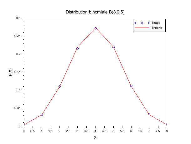 N = 8 ; p = 0.5; m = 50000; X = grand(m,1,"bin",N,p); bins = (0:N)'; [i_bin, counts] = dsearch(X, bins, "d"); Pexp = counts/m; Pexa = binomial(p,N); scf() ; plot(bins, Pexp, "bo"); plot(bins, Pexa', "r-"); xtitle("Distribution binomiale B(8,0.5)","X","P(X)"); legend(["Tirage","Théorie"]);