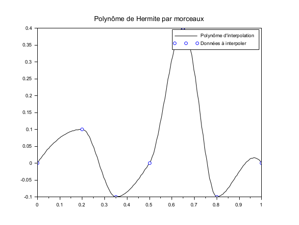 // Définition de la base des fonctions de Hermite : function y=Ll(t, k, x) // Lagrange left on Ik y=(t-x(k+1))./(x(k)-x(k+1)) endfunction function y=Lr(t, k, x) // Lagrange right on Ik y=(t-x(k))./(x(k+1)-x(k)) endfunction function y=Hl(t, k, x) y=(1-2*(t-x(k))./(x(k)-x(k+1))).*Ll(t,k,x).^2 endfunction function y=Hr(t, k, x) y=(1-2*(t-x(k+1))./(x(k+1)-x(k))).*Lr(t,k,x).^2 endfunction function y=Kl(t, k, x) y=(t-x(k)).*Ll(t,k,x).^2 endfunction function y=Kr(t, k, x) y=(t-x(k+1)).*Lr(t,k,x).^2 endfunction x = [0 ; 0.2 ; 0.35 ; 0.5 ; 0.65 ; 0.8 ; 1]; y = [0 ; 0.1 ;-0.1 ; 0 ; 0.4 ;-0.1 ; 0]; d = [1 ; 0 ; 0 ; 1 ; 0 ; 0 ; -1]; X = linspace(0, 1, 200)'; i_bin = dsearch(X, x); // Affichage de la courbe : Y = y(i_bin).*Hl(X,i_bin) + y(i_bin+1).*Hr(X,i_bin) + d(i_bin).*Kl(X,i_bin) + d(i_bin+1).*Kr(X,i_bin); scf(); plot(X,Y,"k-"); plot(x,y,"bo") xtitle("Polynôme de Hermite par morceaux"); legend(["Polynôme d''interpolation","Données à interpoler"]); // NOTE : pour vérifier, décommenter et exécuter la ligne suivante // YY = interp(X,x,y,d); plot2d(X,YY,3,"000")