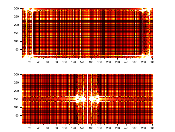 // Make a 2D image t = 0:0.1:30; x = 3*sin(t')*cos(2*t)+8*sin(3*t')*sin(5*t)+.. 0.5*sin(5*t')*sin(5*t)+3*rand(t')*rand(t); // Compute the fft y = fft(x,-1); // Display clf(); gcf().color_map = hot(256); subplot(2,1,1); Matplot(abs(y)) subplot(2,1,2); Matplot(fftshift(abs(y)))