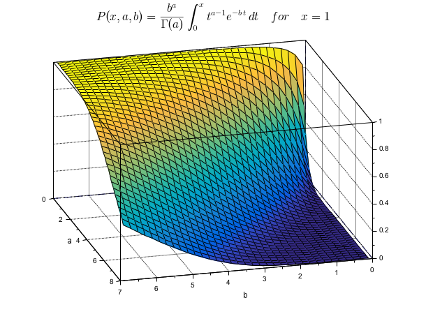 a = 0.1:0.2:8; b = 0.1:0.2:7; [A, B] = ndgrid(a, b); P = gamma(1,A,B); clf gcf().color_map = parula(100); surf(b,a,P) title("$P(x,a,b)=\frac{b^a}{\Gamma(a)}\int_0^x\! t^{a-1}e^{-b\,t}\,dt\quad for\quad x=1$","fontsize",3.7) xlabel("b", "fontsize",2) ylabel("a", "fontsize",2) zlabel("") gca().rotation_angles = [58 75]; xgrid