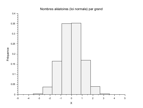 // Renvoie une matrice de taille 400 x 800 de doubles aléatoires, // avec une distribution normale de moyenne 0 et d'écart-type 1. R = grand(400, 800, "nor", 0, 1); scf(); histplot(10, R); xtitle("Nombres aléatoires (loi normale) par grand", "X", "Fréquence");