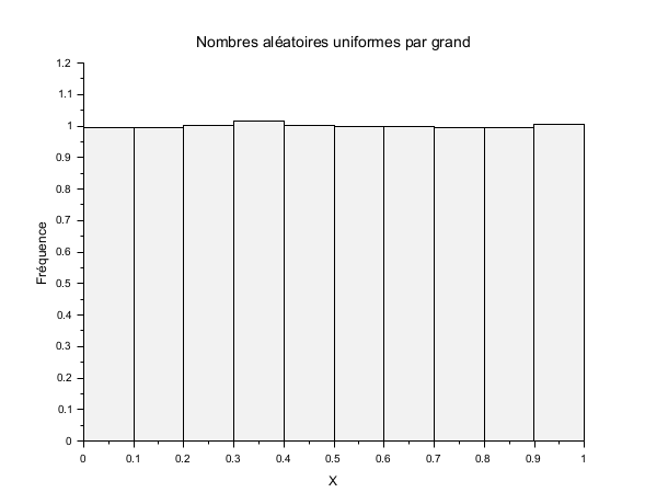 // Renvoie une matrice de taille 400 x 800 de doubles aléatoires, // uniformes dans [0, 1). R = grand(400, 800, "def"); scf(); histplot(10, R); xtitle("Nombres aléatoires uniformes par grand", "X", "Fréquence");