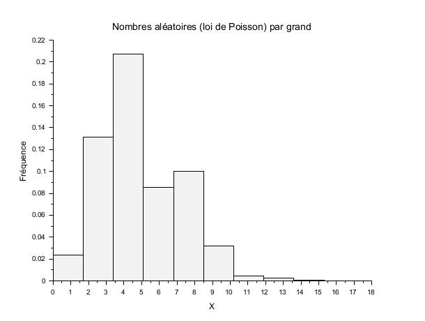 // Renvoie une matrice de taille 400 x 800 de doubles aléatoires, // avec une distribution de Poisson de moyenne 5. R = grand(400, 800, "poi", 5); scf(); histplot(10, R); xtitle("Nombres aléatoires (loi de Poisson) par grand", "X", "Fréquence");