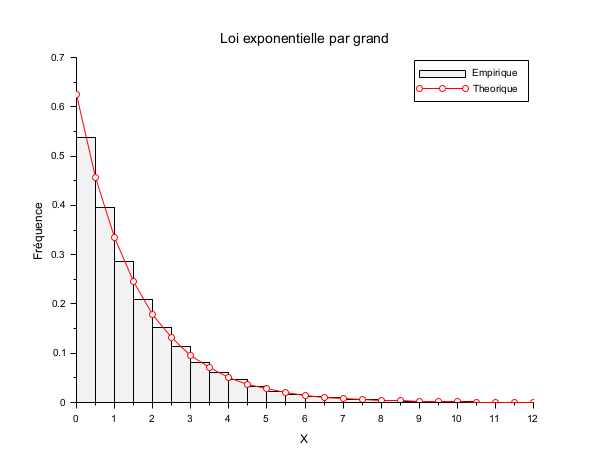 lambda = 1.6; N = 100000; X = grand(1, N, "exp", lambda); scf(); classes = linspace(0, 12, 25); histplot(classes, X); x = linspace(0, 12, 25); y = (1/lambda)*exp(-(1/lambda)*x); plot(x, y, "ro-"); legend(["Empirique" "Theorique"]); xtitle("Loi exponentielle par grand", "X", "Fréquence");