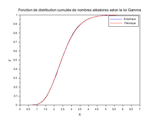 N = 10000; A = 10; B = 4; R = grand(1, N, "gam", A, B); XS = gsort(R, "g", "i")'; PS = (1:N)'/N; P = cdfgam("PQ", XS, A*ones(XS), B*ones(XS)); scf(); plot(XS, PS, "b-"); // Empirical distribution plot(XS, P, "r-"); // Theoretical distribution legend(["Empirique" "Théorique"]); xtitle("Fonction de distribution cumulée de nombres aléatoires selon la loi Gamma", "X", "F");