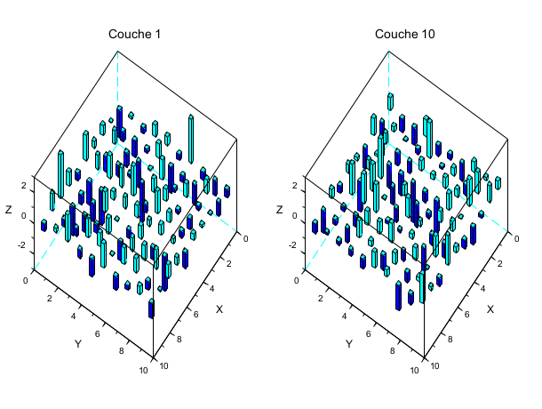 // Retourne une hypermatrice 400 x 800 x 10 de nombre aléatoires, // avec la distribution normale, une moyenne de 0 et un écart-type de 1. // Affichage de la première et dernière couches. R = grand(10,10,10,"nor",0,1); subplot(1,2,1) bar3d(R(:,:,1)); xtitle("Couche 1"); subplot(1,2,2) bar3d(R(:,:,10)); xtitle("Couche 10");