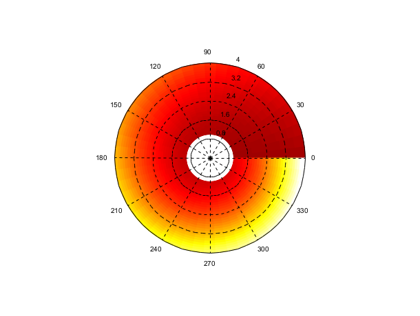 rho=1:0.1:4;theta=(0:0.02:1)*2*%pi; z=30+round(theta'*(1+rho.^2)); f=gcf(); f.color_map= hot(128); clf();graypolarplot(theta,rho,z)