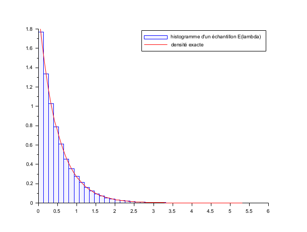lambda = 2; X = grand(100000,1,"exp", 1/lambda); Xmax = max(X); clf() histplot(40, X, style=2); x = linspace(0,max(Xmax),100)'; plot2d(x,lambda*exp(-lambda*x),strf="000",style=5) legend(["histogramme d''un échantillon E(lambda)" "densité exacte"]);