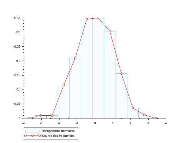 n = 10; data = rand(1,1000,"normal"); clf(); histplot(n, data, style=12, polygon=%t); legend(["Histogramme normalisé" "Courbe des fréquences"],"lower_caption");