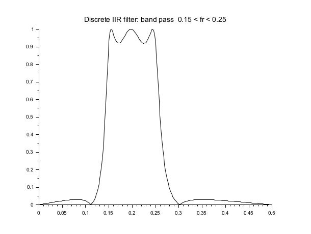 hz=iir(3,'bp','ellip',[.15 .25],[.08 .03]); [hzm,fr]=frmag(hz,256); plot2d(fr',hzm') xtitle('Discrete IIR filter: band pass 0.15 < fr < 0.25 ',' ',' '); q=poly(0,'q'); //to express the result in terms of the delay operator q=z^-1 hzd=horner(hz,1/q)