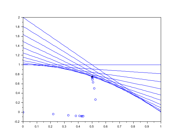 n=11; A = [2*linspace(0,1,n)',ones(n,1)]; b = 1 + linspace(0,1,n)'.^2; c=[-1;-1]; // Plot the constraints scf(); for i = 1 : n plot(linspace(0,1,100),b(i)-A(i,1)*linspace(0,1,100),"b-") end // Run the optimization xopt=karmarkar([],[],c,[],[],[],[],myoutputfunction,A,b); // Plot the starting and ending points plot(xopt(1),xopt(2),"k*")