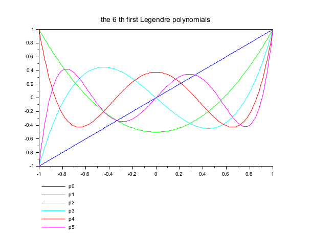 // example 1 : plot of the 6 first Legendre polynomials on (-1,1) l = nearfloat("pred",1); x = linspace(-l,l,200)'; y = legendre(0:5, 0, x); clf() plot2d(x,y', leg="p0@p1@p2@p3@p4@p5@p6") xtitle("the 6 th first Legendre polynomials")