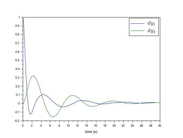 // Form the state space model (assume full state output) M = 1; m = 0.2; k = 0.1; b = 0.004; A = [ 0 1 0 0 -k/M -b/M k/M b/M 0 0 0 1 k/m b/m -k/m -b/m]; B = [0; 1/M; 0; 0]; C = eye(4,4); P = syslin("c",A, B, C); //The compensator weights Q_xx=diag([15 0 3 0]); //Weights on states R_uu = 0.5; //Weight on input Kc=lqr(P,Q_xx,R_uu); //form the Plant+compensator system C=[1 0 0 0 //dy1 0 0 1 0];//dy2 S=C*(P/.(-Kc)); //check system stability and(real(spec(S.A))<0) // Check by simulation dt=0.1; t=0:dt:30; u=0.1*rand(t); y=csim(u,t,S,[1;0;0;0]); clf;plot(t',y');xlabel(_("time (s)")) L=legend(["$dy_1$","$dy_2$"]);L.font_size=4;